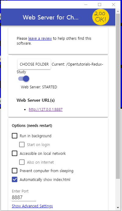웹서버를 올리는 방법으로는 여러 가지 방법이 있겠지만 저는 최소한의 환경을 원했으므로 크롬 웹스토어에서 Web Server for Chrome이라는 웹앱을 설치하여 사용하였습니다.