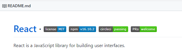 Facebook React.js의 뱃지 제가 README.md 파일을 작성하면서 지금까지 사용한 뱃지는 TravisCI의 빌드 뱃지와 현재 개발 여부를 알려주는 커스텀 뱃지 요 두 개였습니다. 개인적으로 레포지토리를 방문하는 사람들에게 현재 개발 진행 여부와 적어도 코드 커버리지 테스트를 테스트한 결과 뱃지를 보여주고 싶었기 때문입니다.